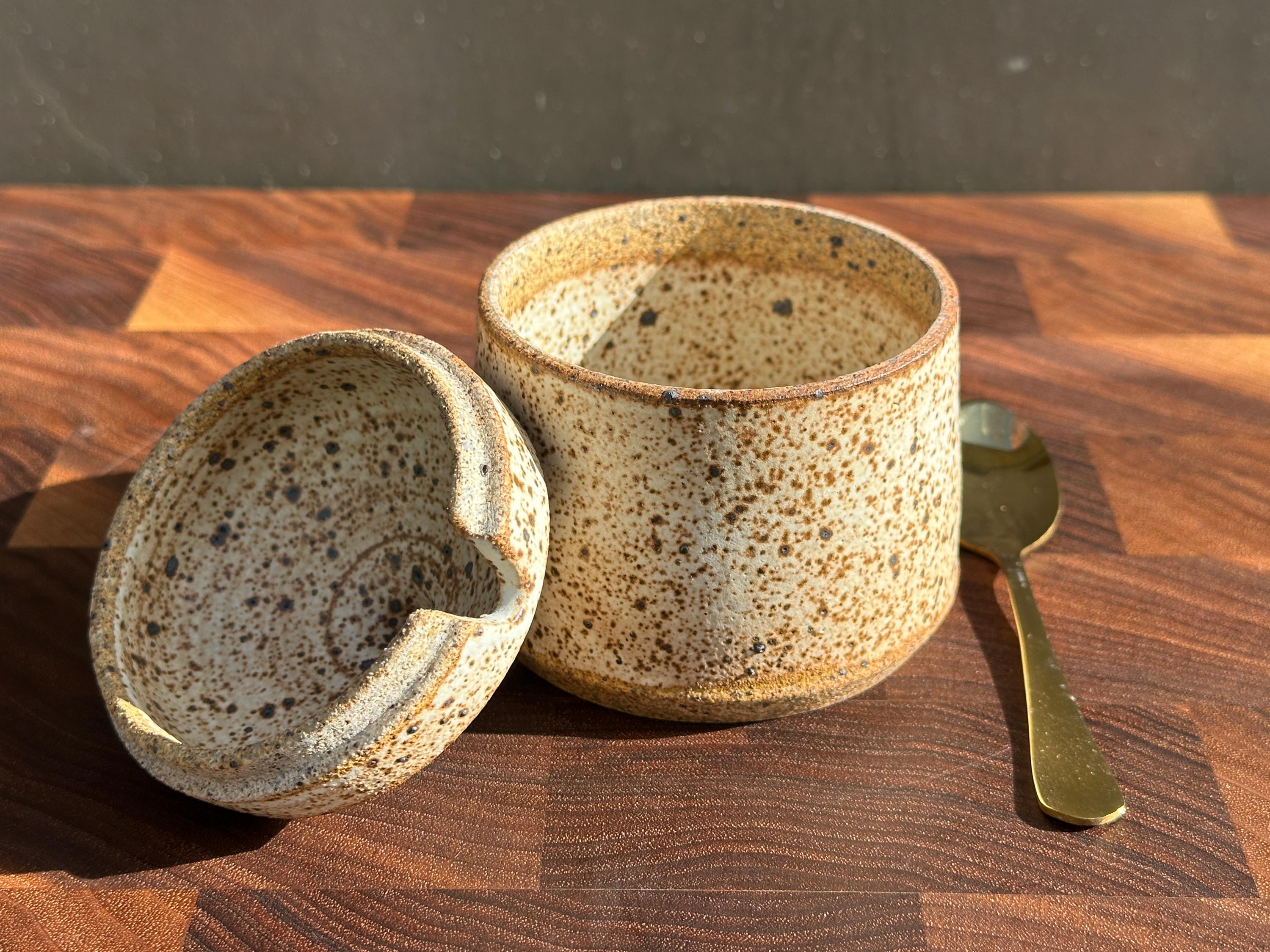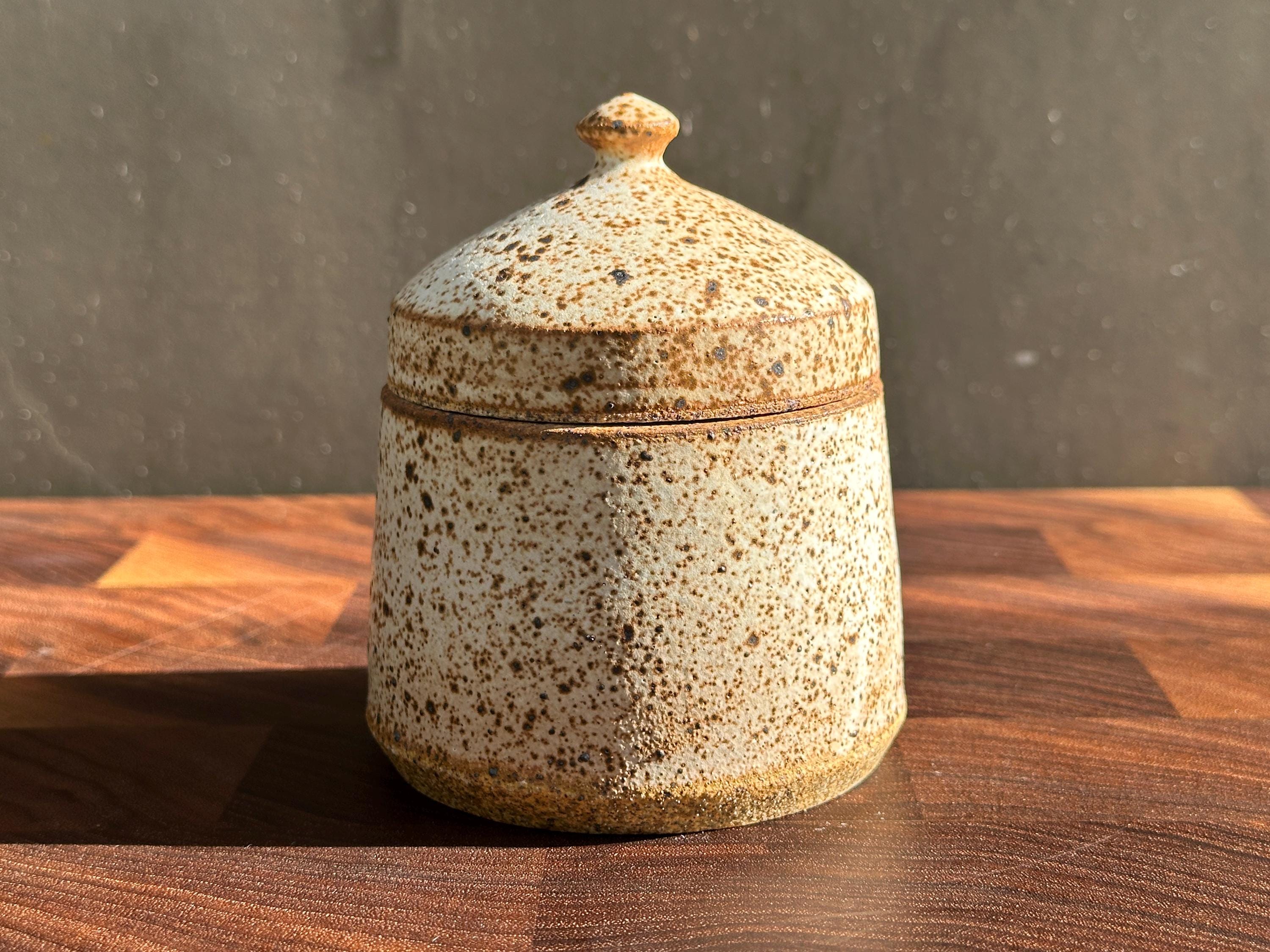 This lidded container can be used as a salt cellar, salt container, spice dish, or sugar bowl.