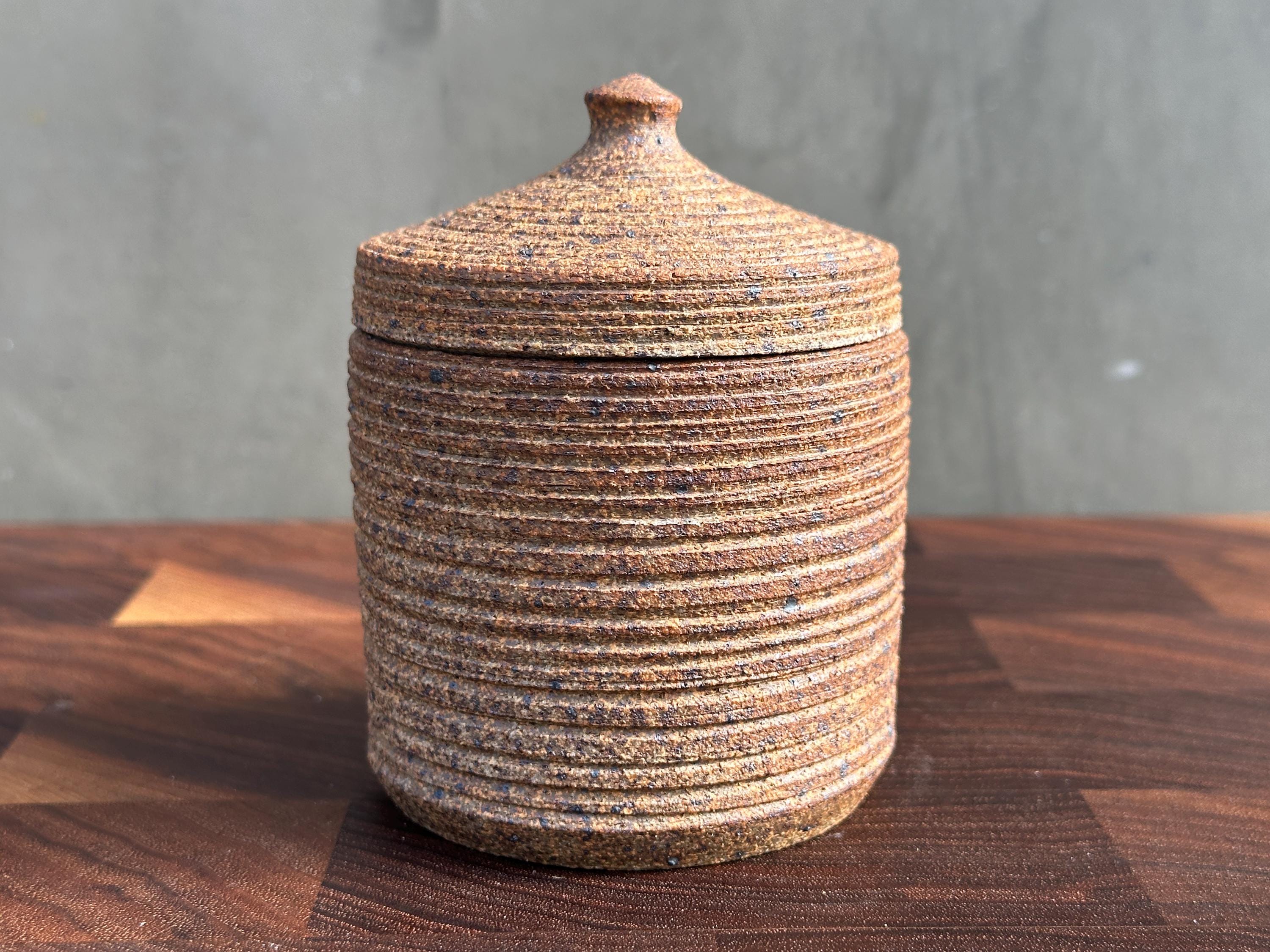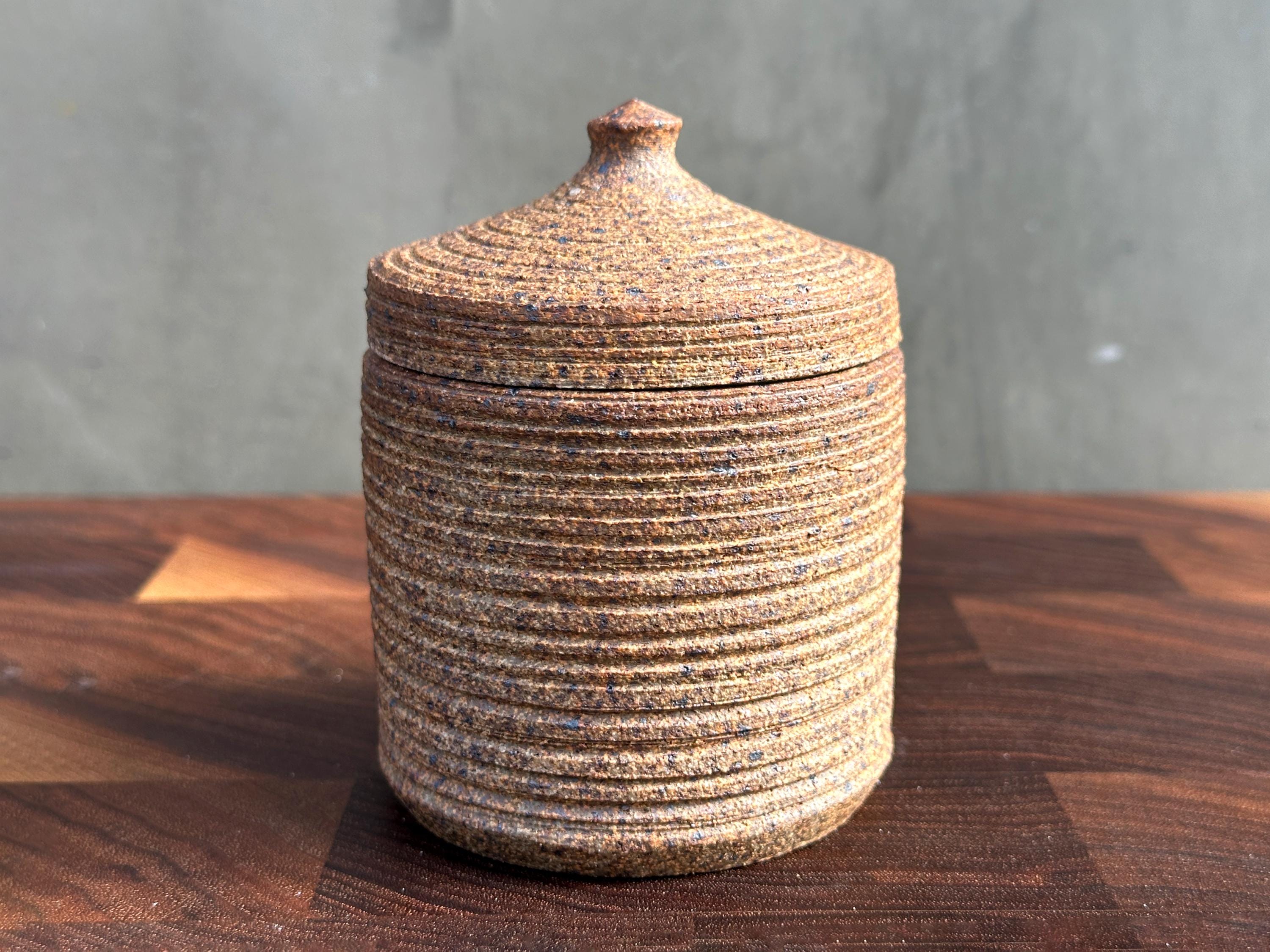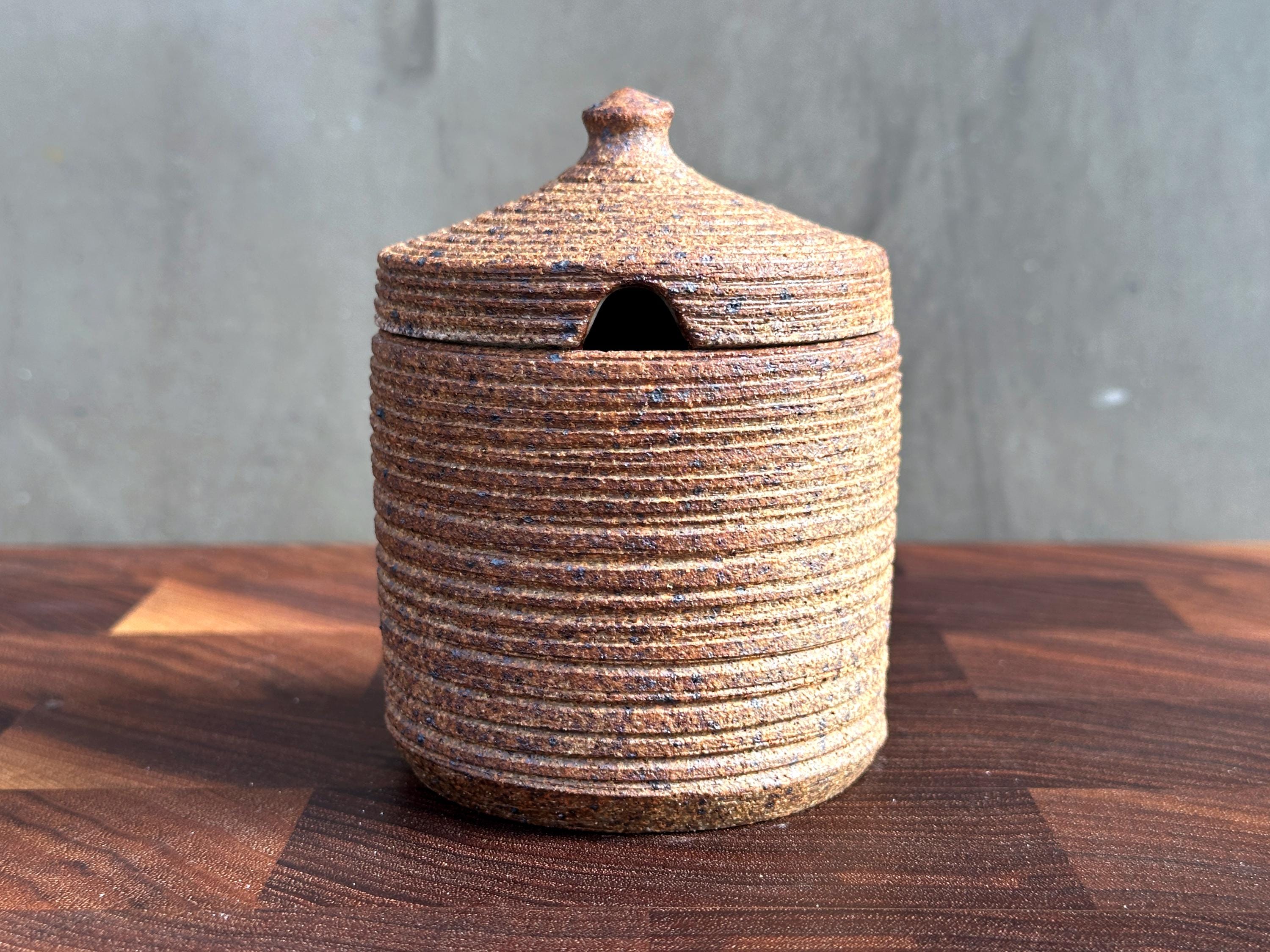 This lidded container can be used for honey or as a salt cellar, salt container, spice dish, or sugar bowl.