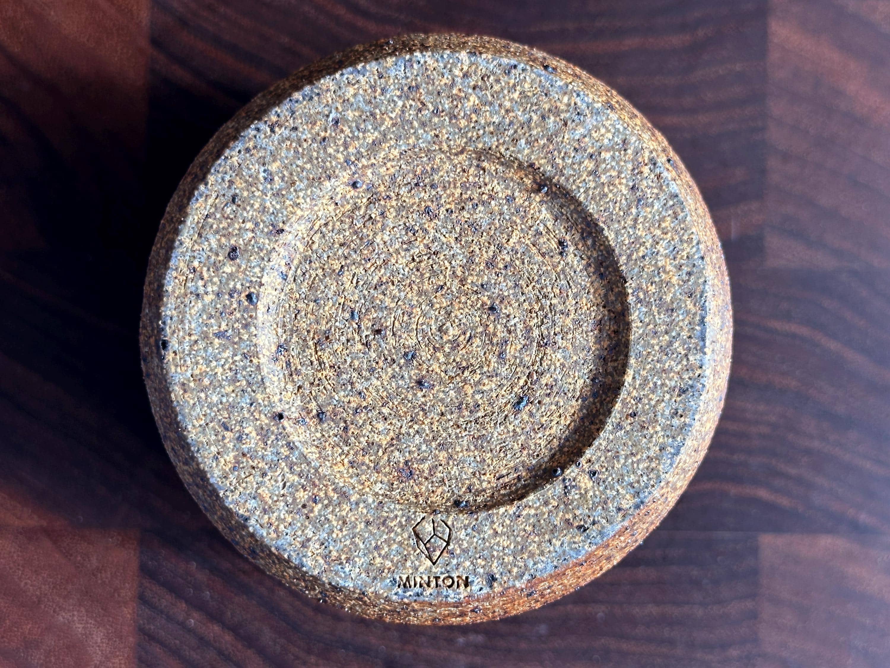 Unglazed carved speckled exterior with glossy interior glaze