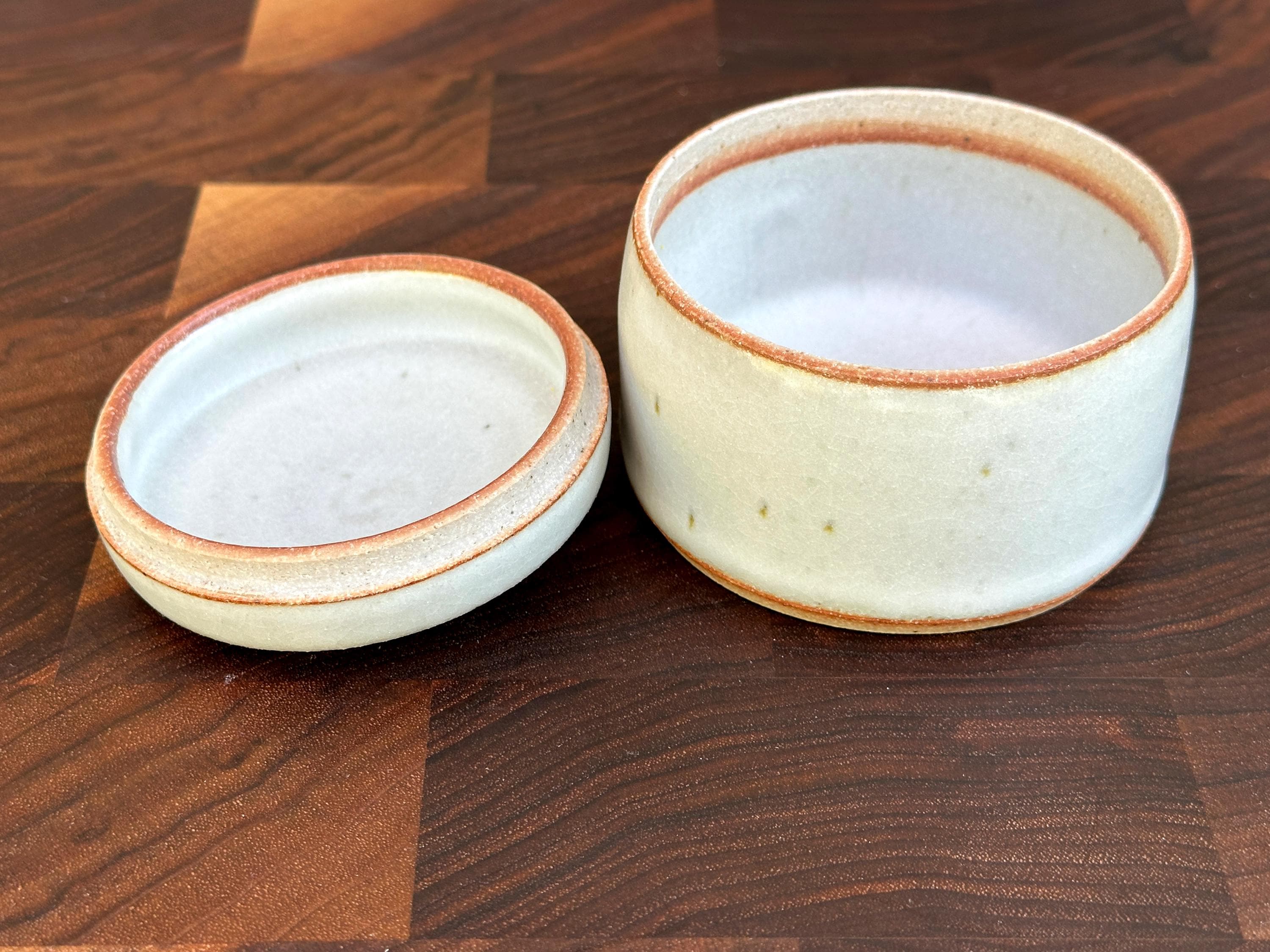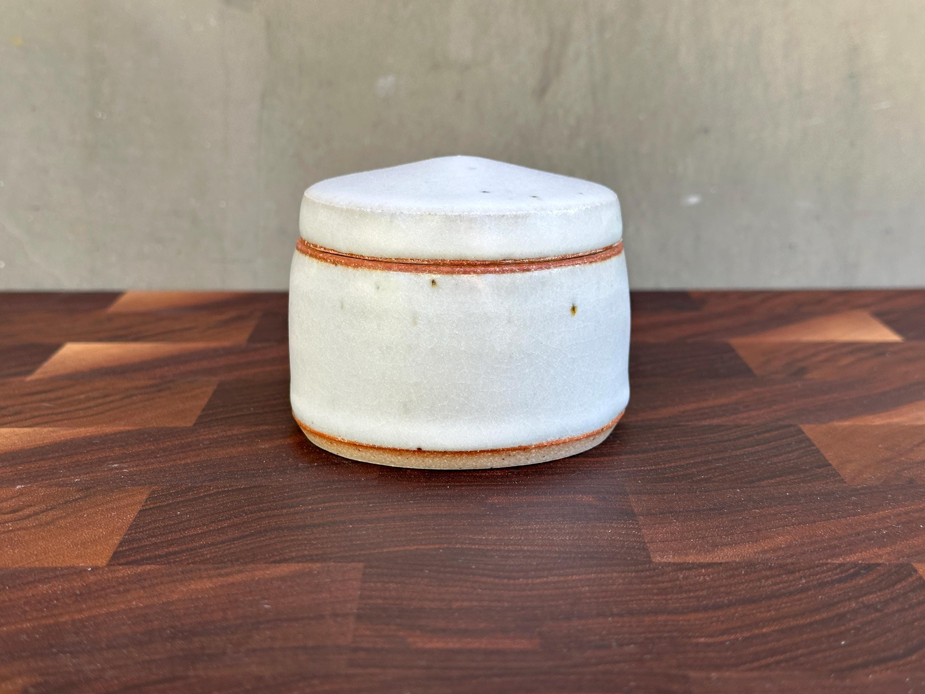 This lidded container can be used as a salt cellar, salt container, spice dish, or sugar bowl.